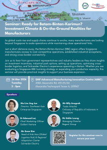 • Short description: As global costs rise and supply chains continue to evolve, many manufacturers are looking beyond Singapore to scale operations while maintaining close operational links. Just a short distance away, the Batam–Bintan–Karimun (BBK) region offers Singapore manufacturers access to cost-competitive operations, established industrial ecosystems, and strong cross-border connectivity. Join us to hear from government representatives and industry leaders as they share insights on investment incentives, industrial park options, setting up operations, optimising cross-border logistics, and Schneider Electric’s experience operating in Batam.